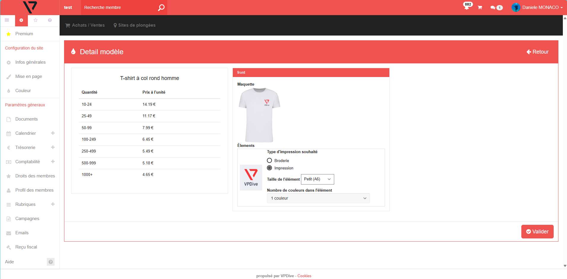 Rendez-vous sur votre espace VPDive et cliquez sur l’icône de la roue crantée, puis sur Print > Produit. Avant de commencer, vous pouvez consulter le catalogue des vêtements disponibles. Même si toutes les références ne sont pas encore en ligne, elles seront ajoutées progressivement selon vos demandes.